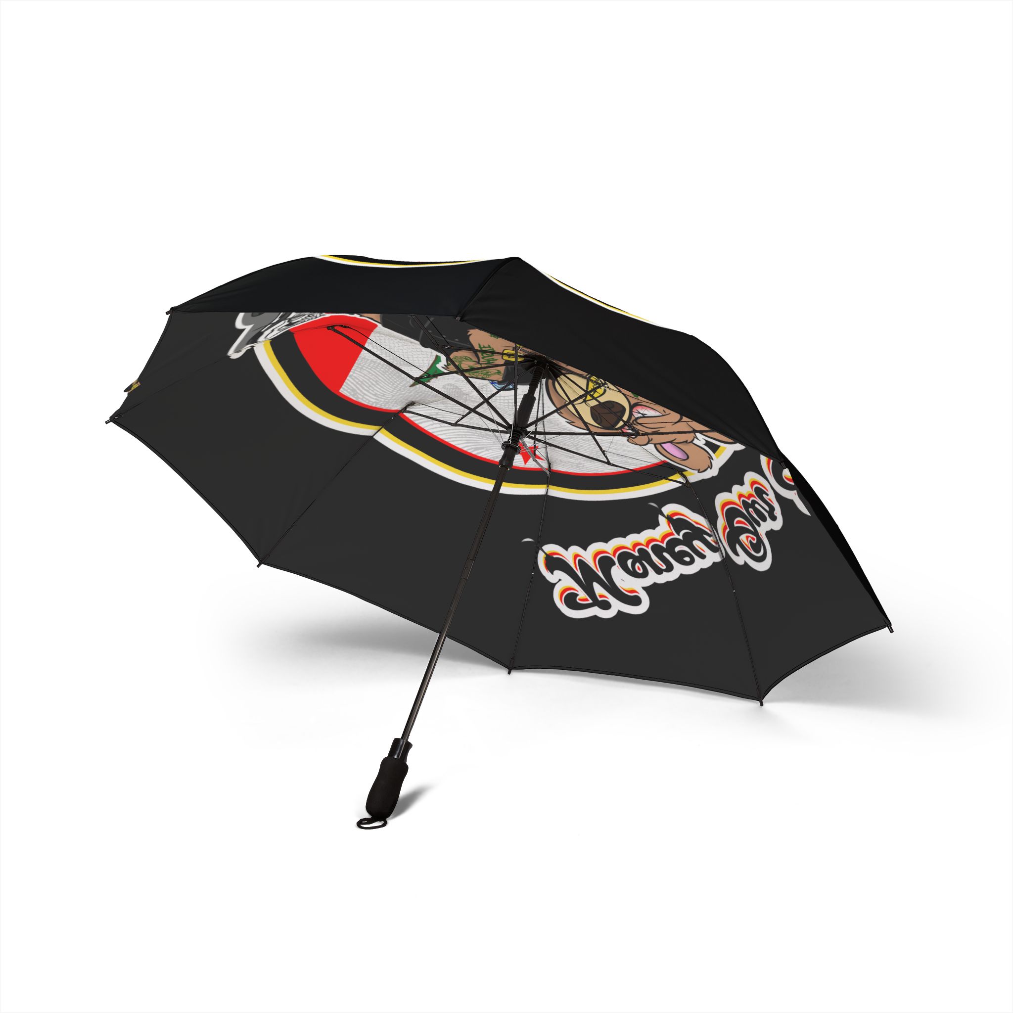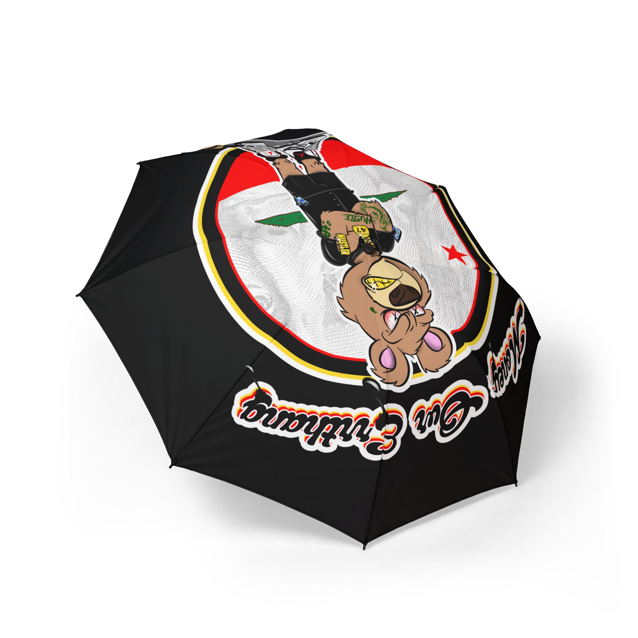 A compact, eye-catching umbrella that brings personality to rainy days. The semi-automatic foldable canopy pops open with one hand, then tucks away into a matching sleeve for quick storage. The 100% polyester pongee fabric is waterproof and printed with fade-resistant sublimation, so the bold graphic and colors stay vivid through storms. Reinforced with eight strong fiber ribs and a comfortable rubber handle, this umbrella feels sturdy in wind yet remains lightweight to carry. A wrist strap and velcro tie wrap keep it secure when not in use—practical, playful, and built to last.