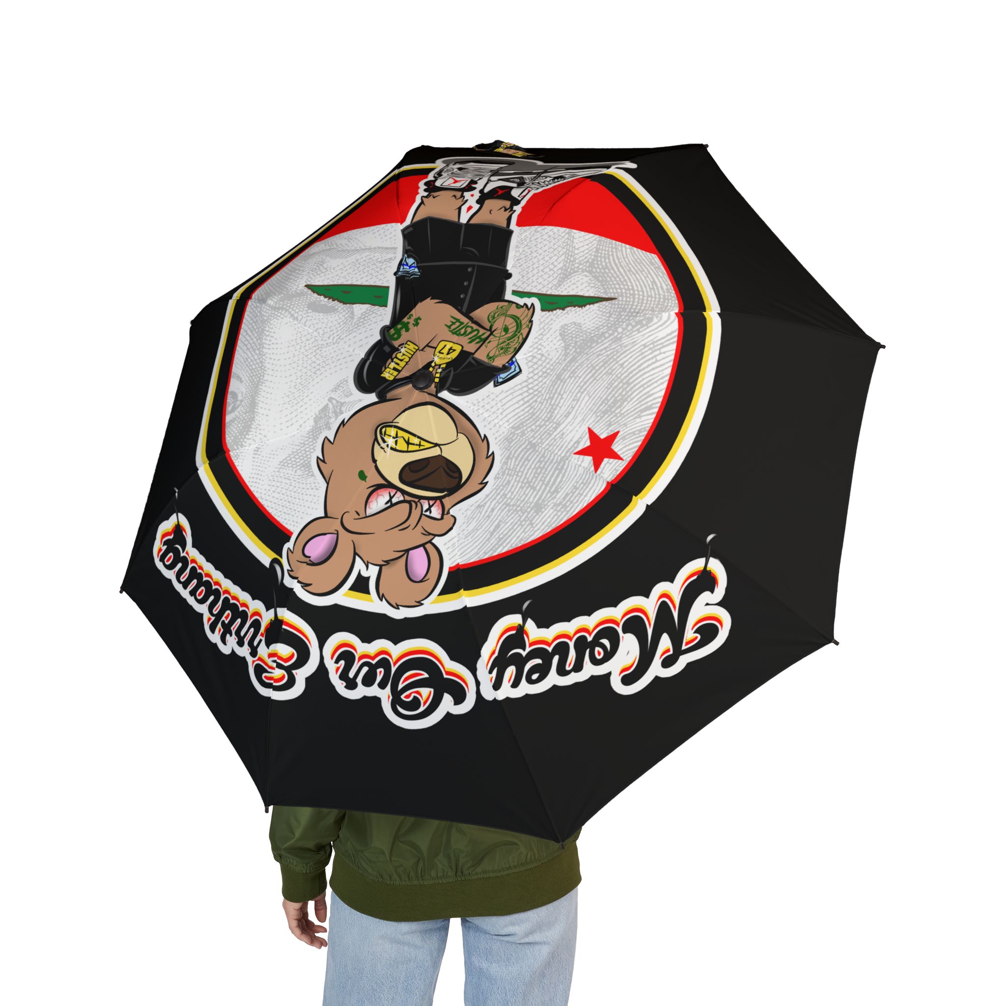 Foldable Umbrella — Cartoon Bear with Flag Design, Compact Semi-Automatic Travel Umbrella
